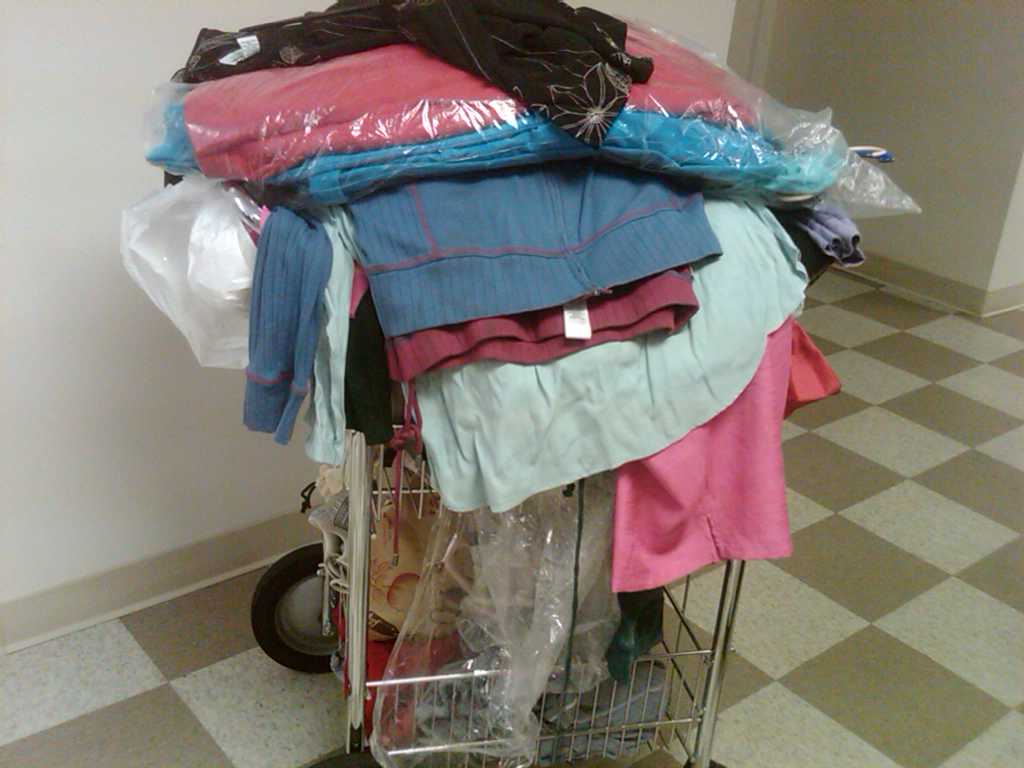 This is only part of one woman’s contribution toward helping low income mothers find work. This is a donation of interview and work clothing (yes, that is a store tags you see) brought to my office and all already on hangers.