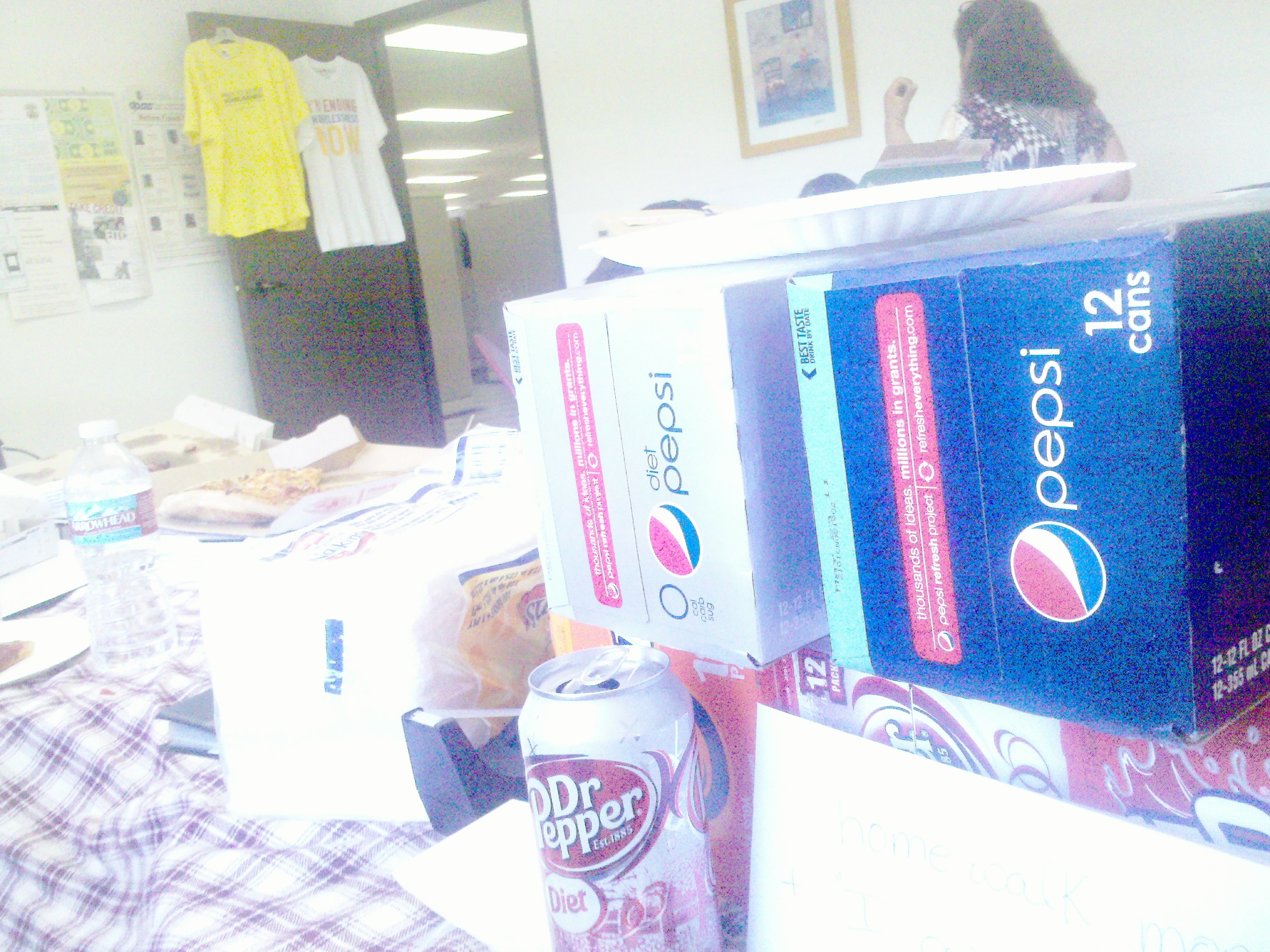 At Mxxxxx in Burbank. Who knew? Pizza is like a drug here; there was a line at 11:30 am of IHSS County workers waiting for the pizza. I spent about $63 on pizza and soda, but the soda I can keep re-using for the next few weeks. I used the Domino’s 2 Medium pizza deal coupons, – but I am still looking for something more affordable to sell for $2.00 each to make our donation to The United Way HomeWalk larger.