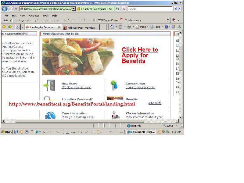 CalWORKS, FoodStamps, Medi-cal applications can be begun on-line. Here is the link. I tried it out for you: pretty simple until you get to the part where you explain the relationships