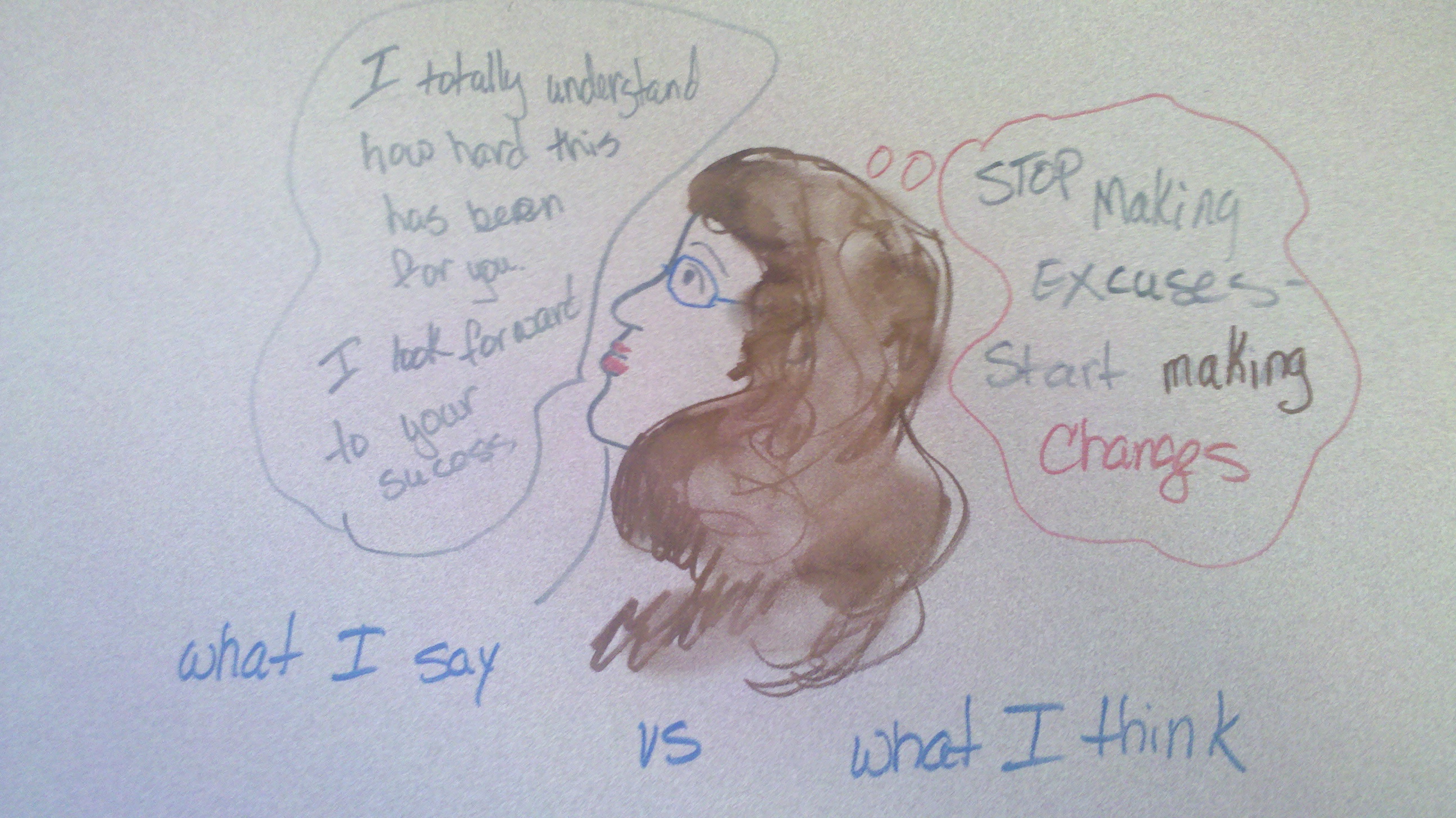 I feel like a two faced witch. I hear the words of encouragement and the pep-talk coming out of my mouth…but sometimes my inner dialogue is very angry.
