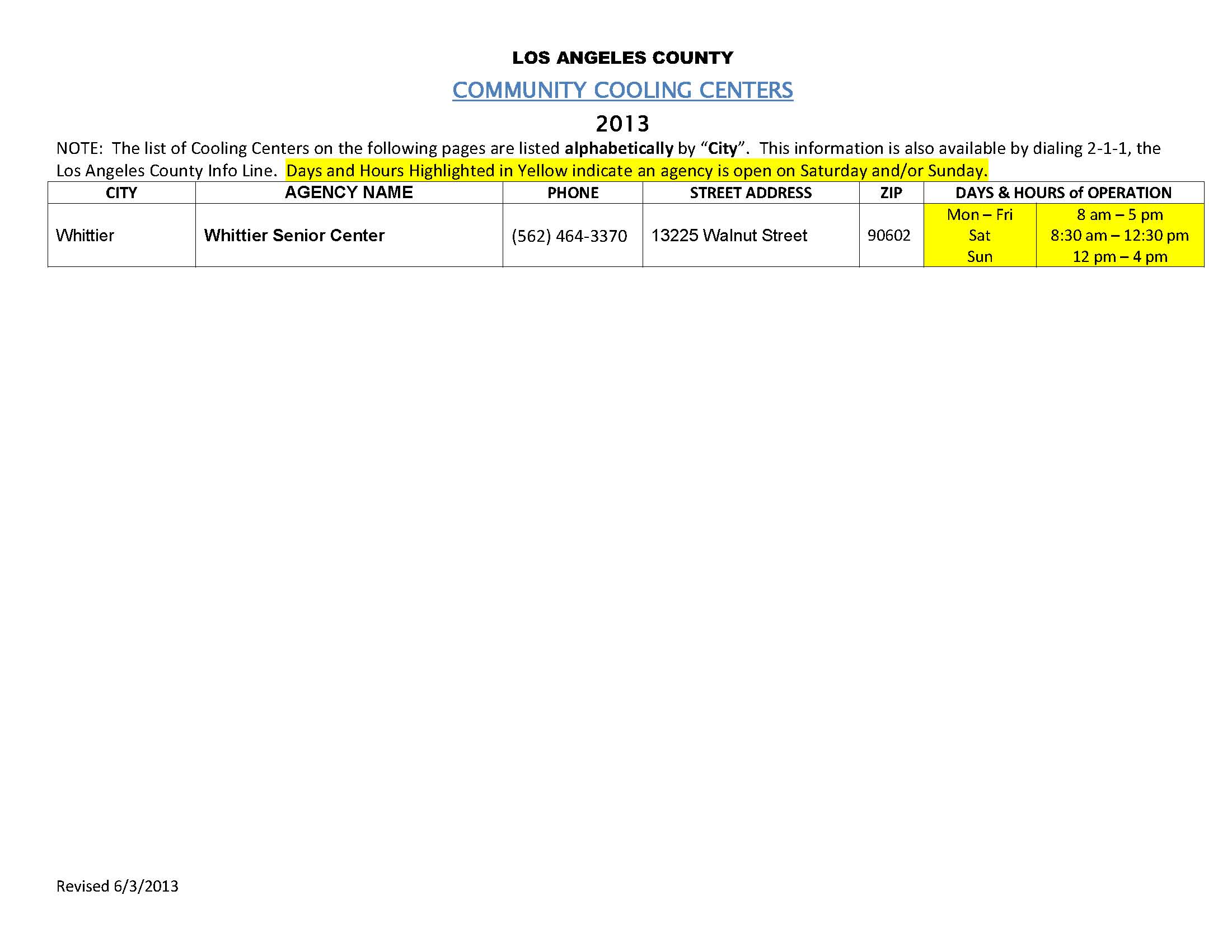 Cooling Center is not operational, check the attached list for another Cooling Center nearest you or call “211”. Check with your