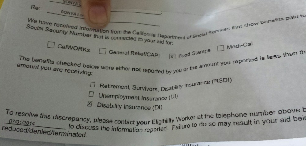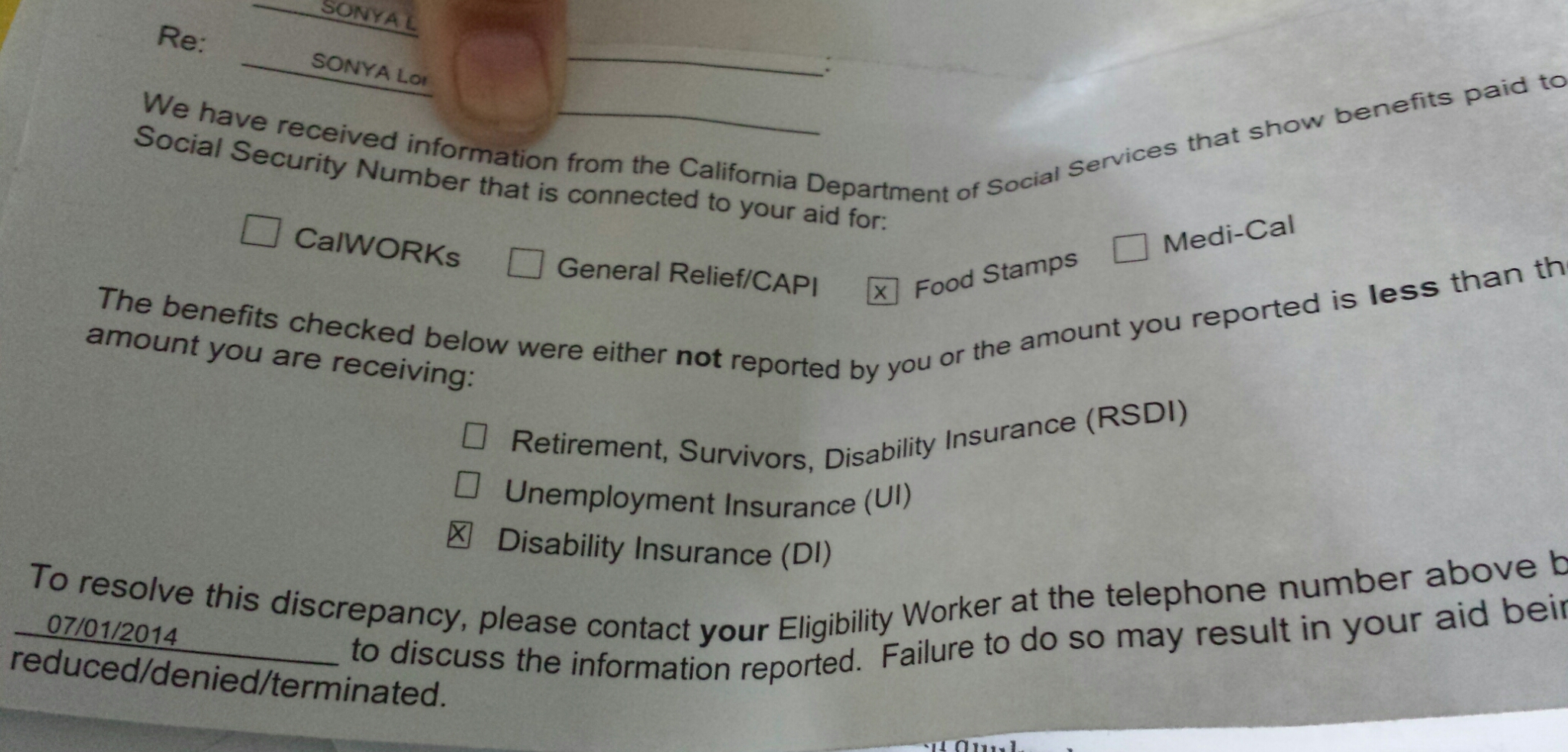 Remember how I disclosed my application for Disability when I applied and all the calls and faxes and emails and letters I’ve written since I received the card 60 days after I met with a worker?!? I went to you so why are you acting like you caught me? I’ve been asking you to terminate my case.