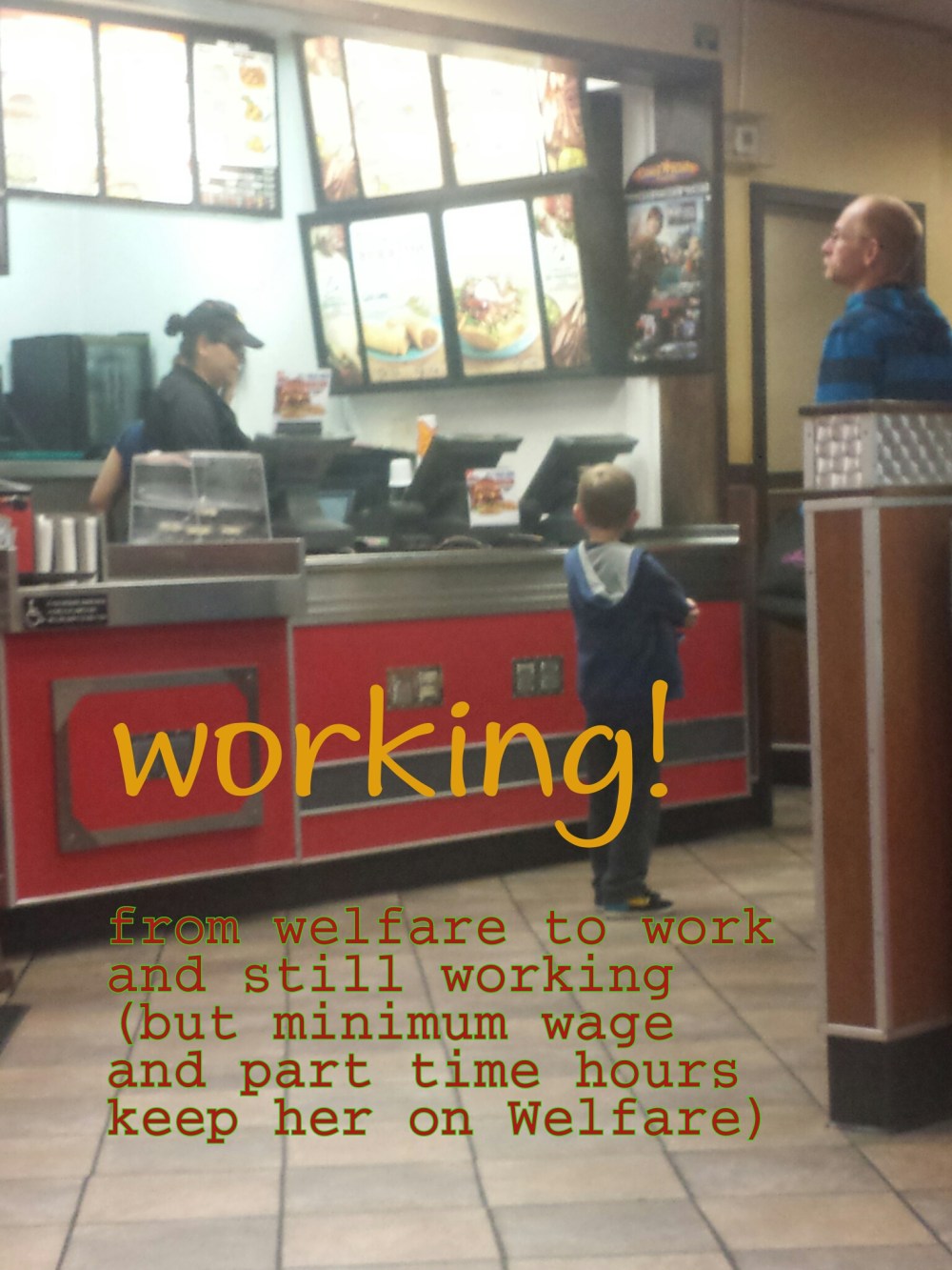 She is working but the low pay and minimum hours keep her tethered to cash assistance and aid… but she feels great about the positive change of even go having go having a job!