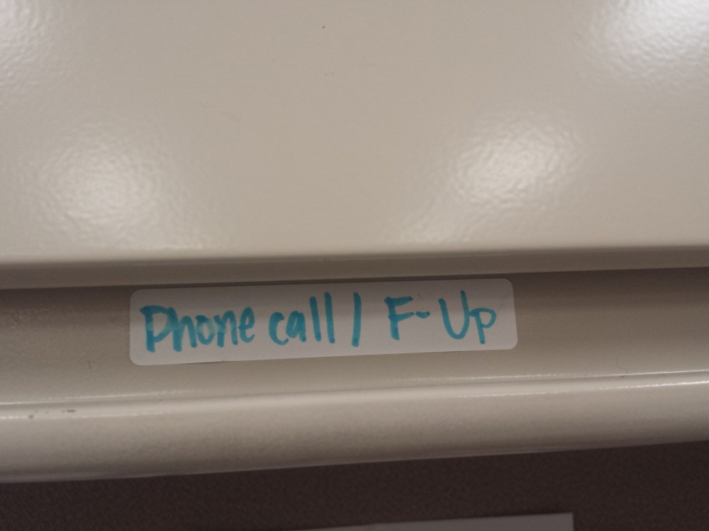 Posted on April 6, 2015April 6, 2015 by Homeless I’m borrowing workspace today and after 6 hours, just noticed this sticker. I assume she means "follow uo". Tell other peeps: Click to share on X (Opens in new window) X Click to share on Facebook (Opens in new window) Facebook Click to email a link to a friend (Opens in new window) Email Click to share on Pinterest (Opens in new window) Pinterest Click to share on LinkedIn (Opens in new window) LinkedIn Click to share on Pocket (Opens in new window) Pocket Click to share on Reddit (Opens in new window) Reddit Click to share on Tumblr (Opens in new window) Tumblr More Click to print (Opens in new window) Print Like Loading... Related