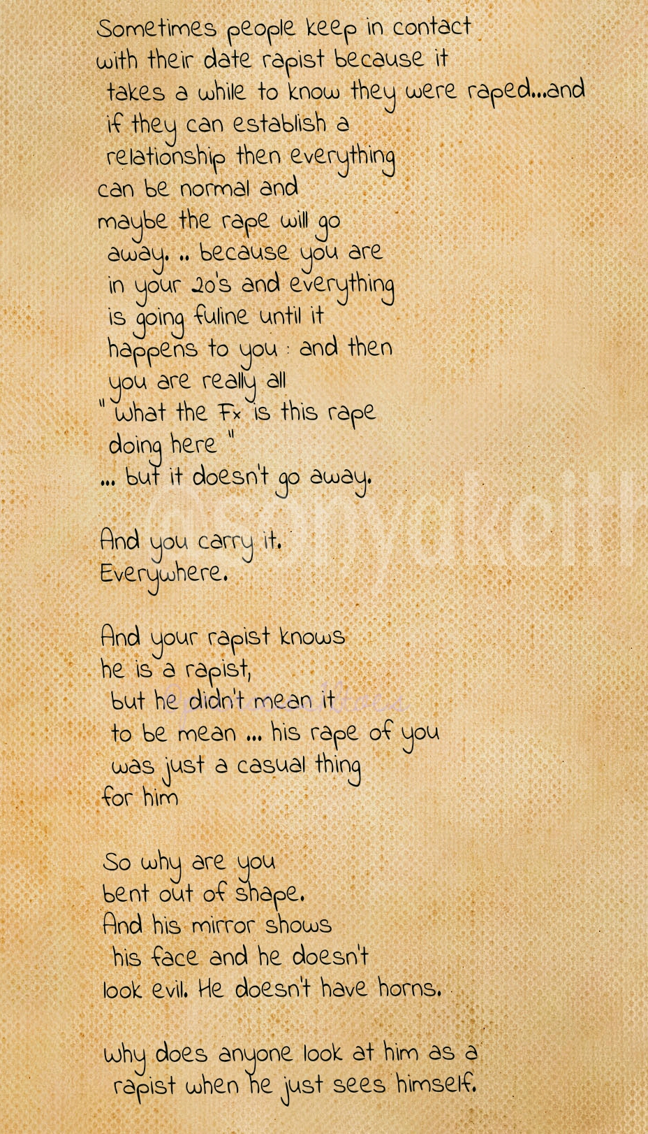 Sometimes people keep in contact with their date rapist because it takes a while to know they were raped…and if they can establish a relationship then everything can be normal and maybe the rape will go away. .. because you are in your 20’s and everything is going fine until it happens to you : and then you are really all ” What the F× is this rape doing here “… but it doesn’t go away.