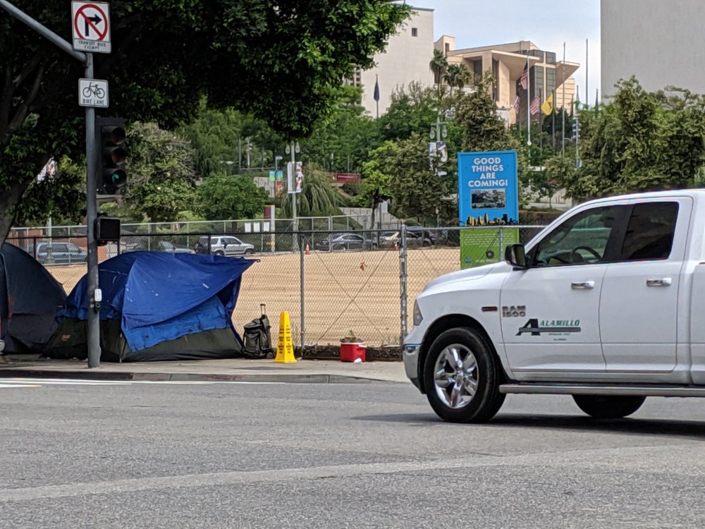 But for whom? That’s a sign about good things coming to the city of Los Angeles, across the street from the police department in City Hall. Does it mean that there are good things coming for the people who live on the sidewalk?