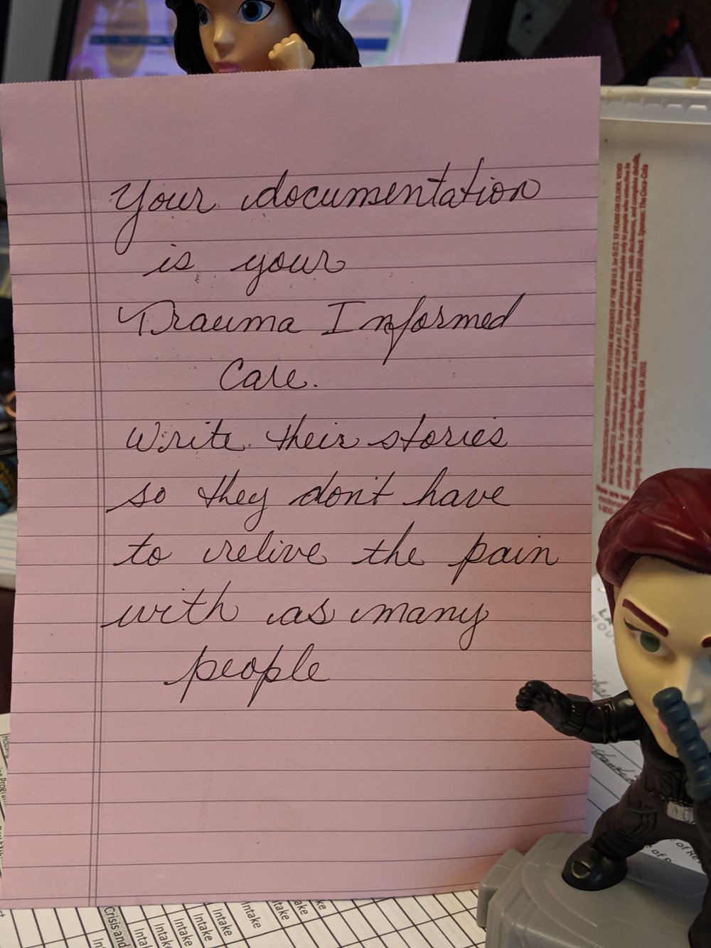 Your a documentation is a form of trauma-informed care. If you tell their story in detail in writing then they don’t have to be tell it to everybody else who would have access to your notes. Reduce the number of times they have to relive their trauma. The story may change and may alter from time to time but give them the respect of documenting their story.