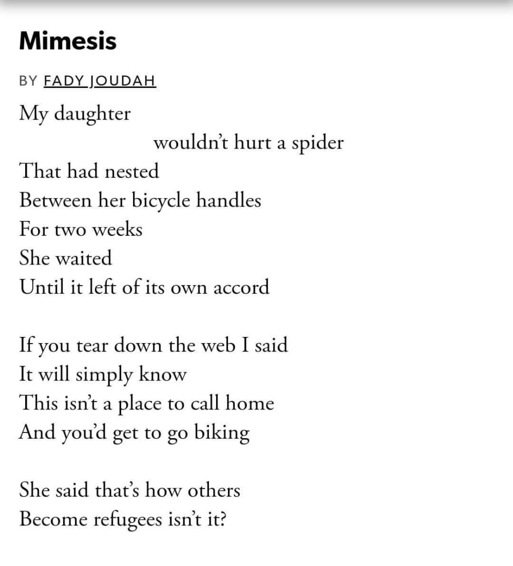 This poem by Fady Joudah made me that no of all the times we have bulldozed tents and shelters in Skid Row with the idea of deterring homeless people from sleeping on the streets.