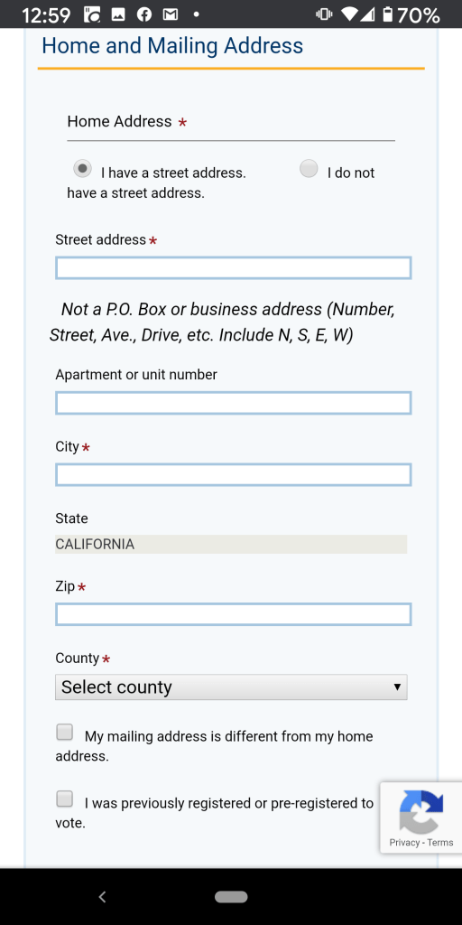 If you are registering via a paper form, use the map on the bottom of the voter registration form, you can identify two cross-streets where you usually stay. If you are registering online, you can check the box that says, “I do not have a street address” in the address section.