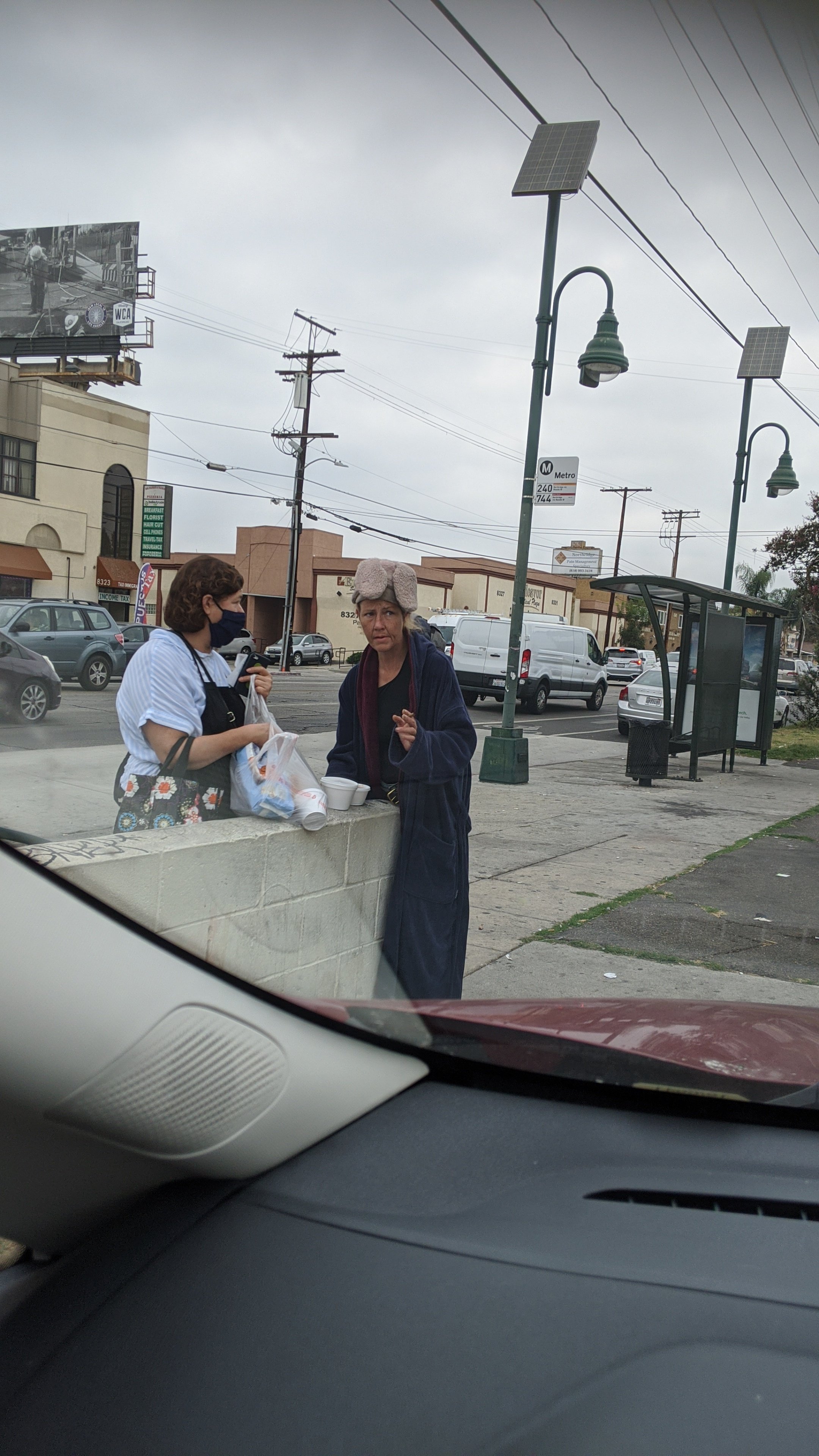 As this lady was walking around and looking for cigarette butts and change on the ground, the local bus pulled up. A woman who works at a restaurant exited the bus with a bag full of individual sizes and servings of soup.